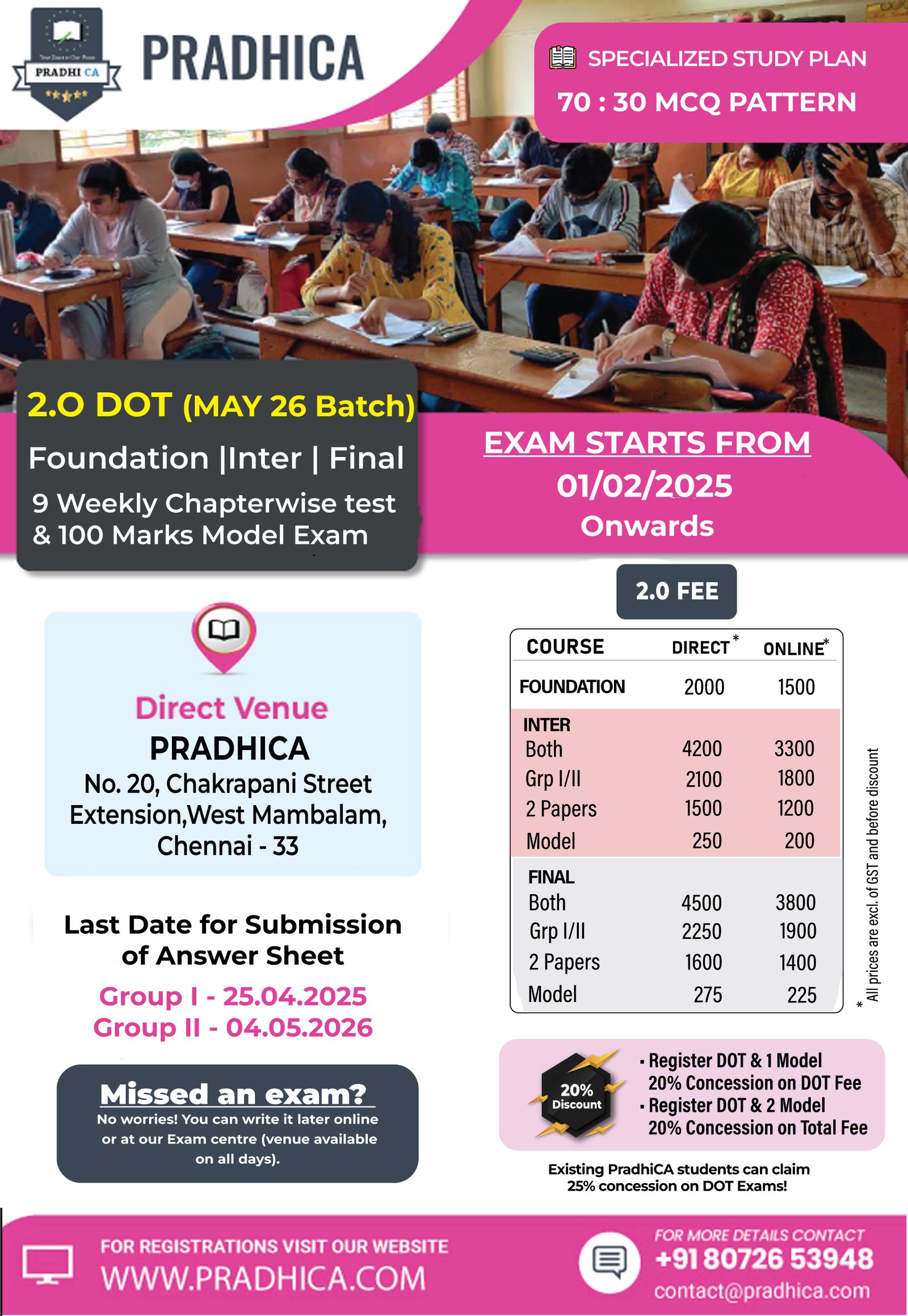 Exam will be conducted both Online & Direct (Chennai) Mode. Online students can write the test on later date also (QP will be available from Scheduled Dates). Direct Students can write the missed exams via Online Mode.