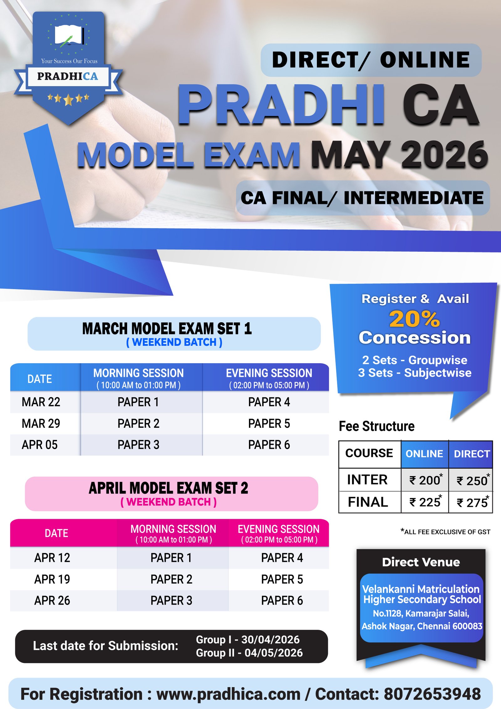 4 Model Exams will be conducted. 2 Sets for Weekend Batch and 2 sets for Alternative Days Batch. Check Exam Timing & Dates in the schedule given below.