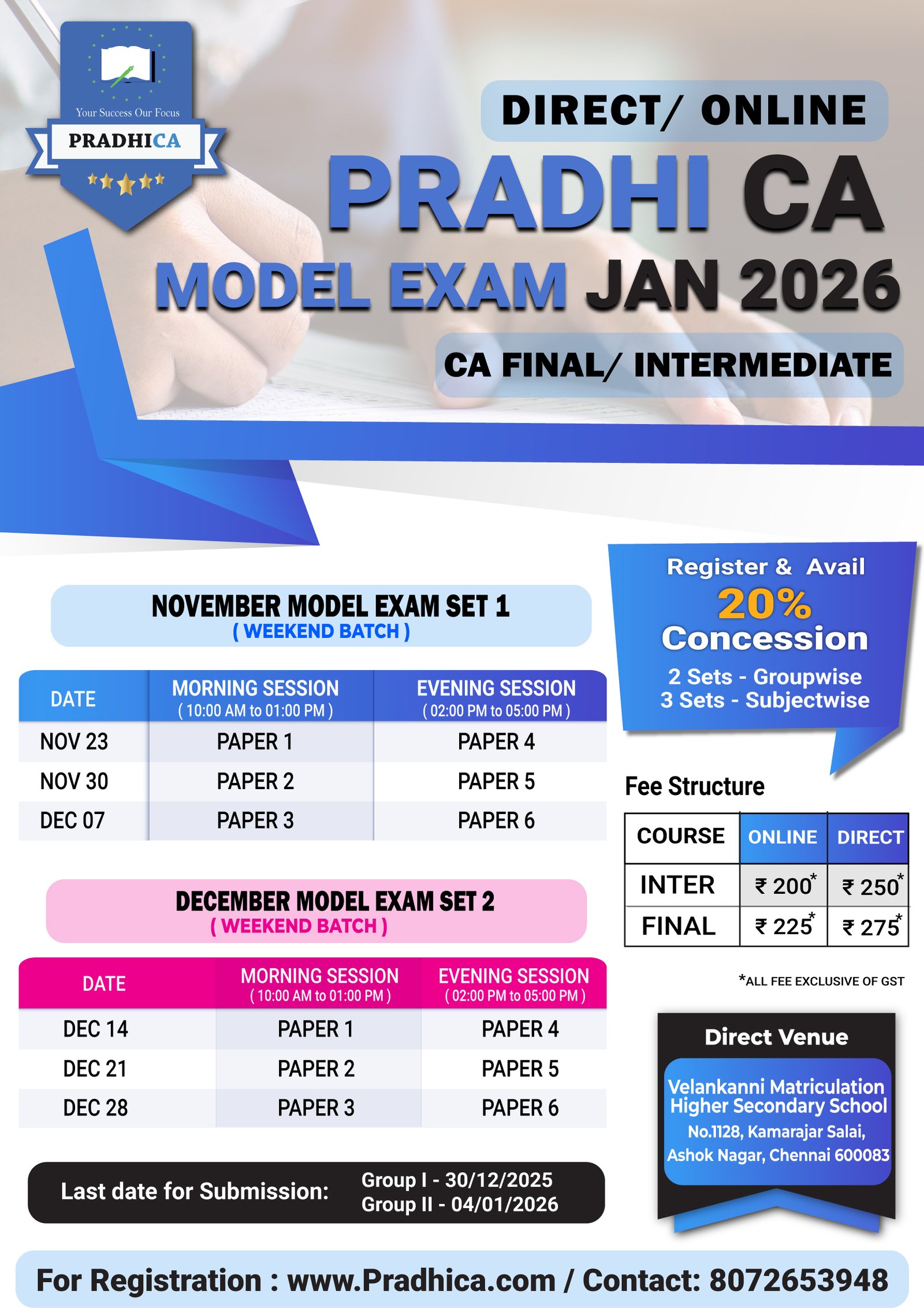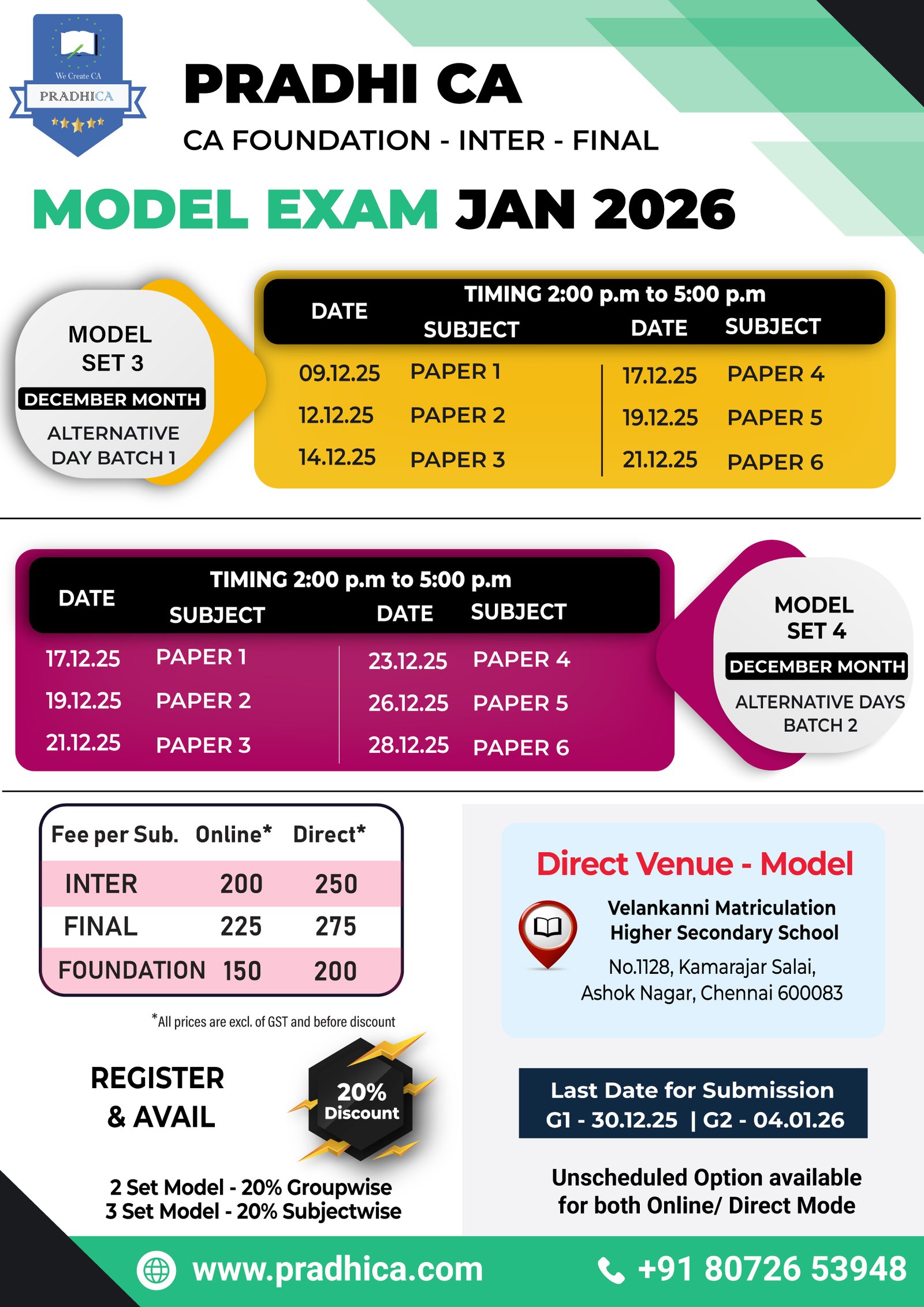 4 Model Exams will be conducted. 2 Sets for Weekend Batch and 2 sets for Alternative Days Batch. Unscheduled Option also available for Registration. Check the Dates in the Image (Schedule) given below.