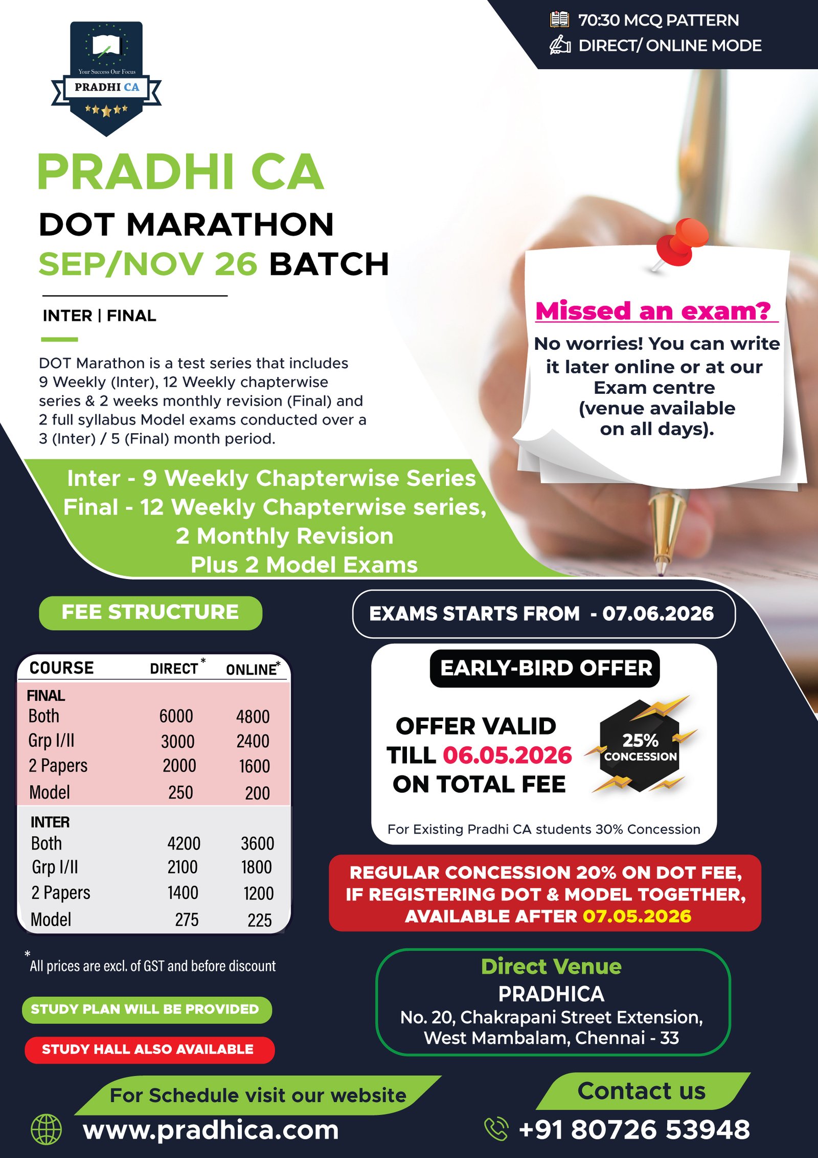 We will also support your Preparation by providing Proper guidance. Frequent follow ups will be done. Study Plan for each week will be Provided. MCQ Workings & Marks Split up in Suggested Answers will also be provided