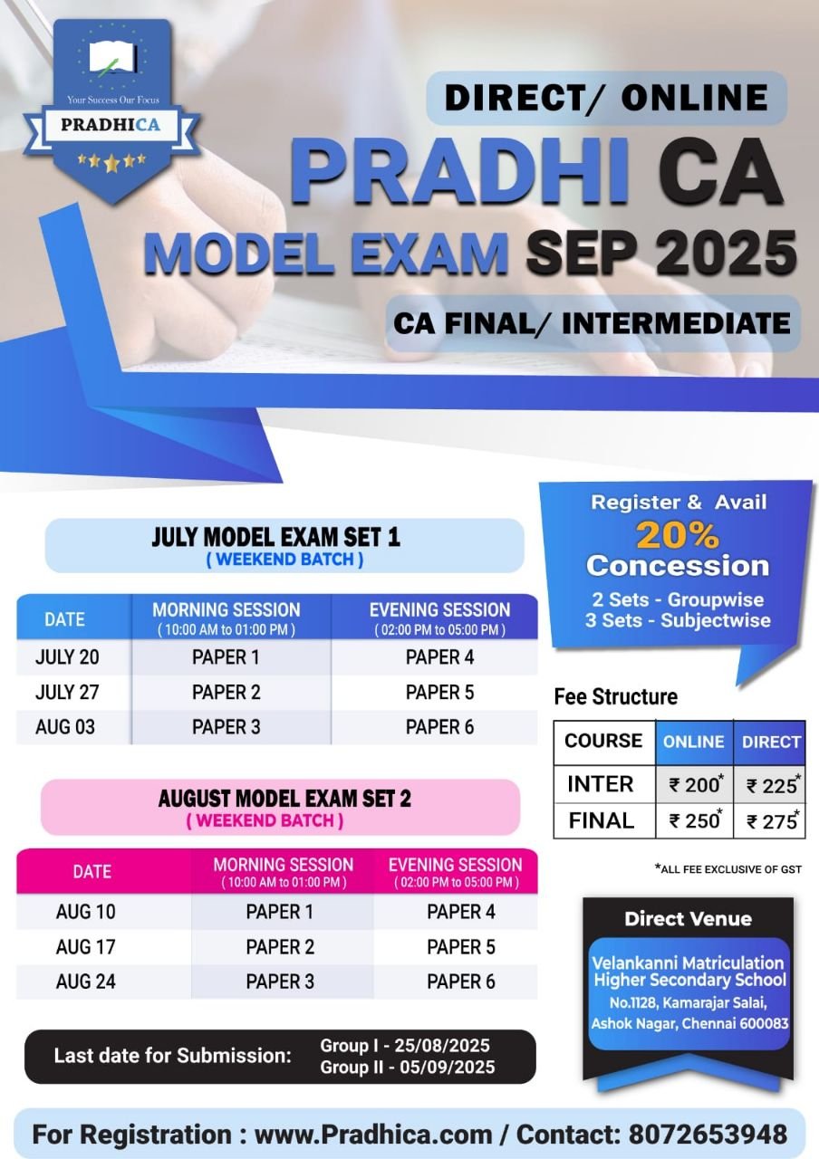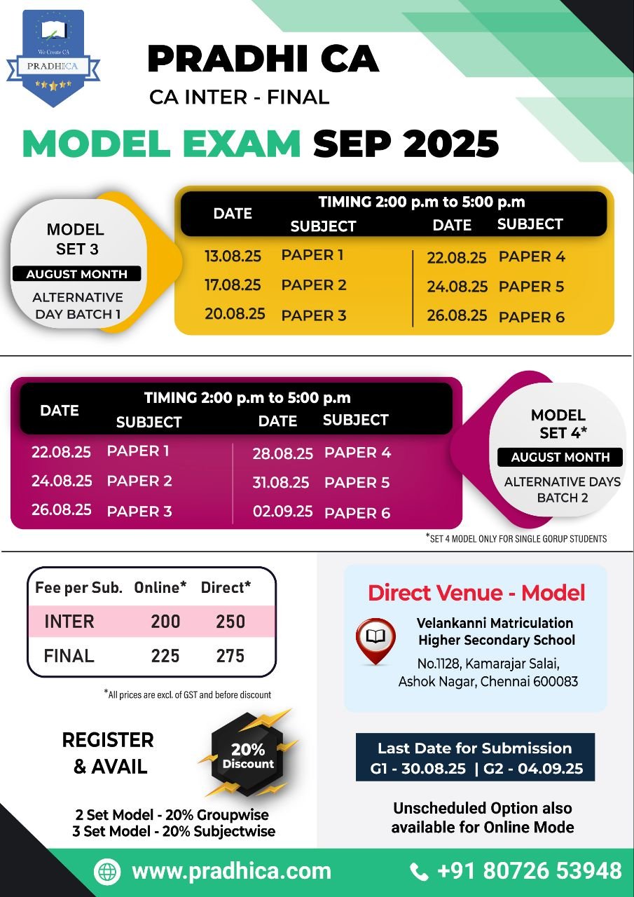 4 Model Exams will be conducted. 2 Sets for Weekend Batch and 2 sets for Alternative Days Batch. Unscheduled Option also available for Registration. Check the Dates in the Image (Schedule) given below.